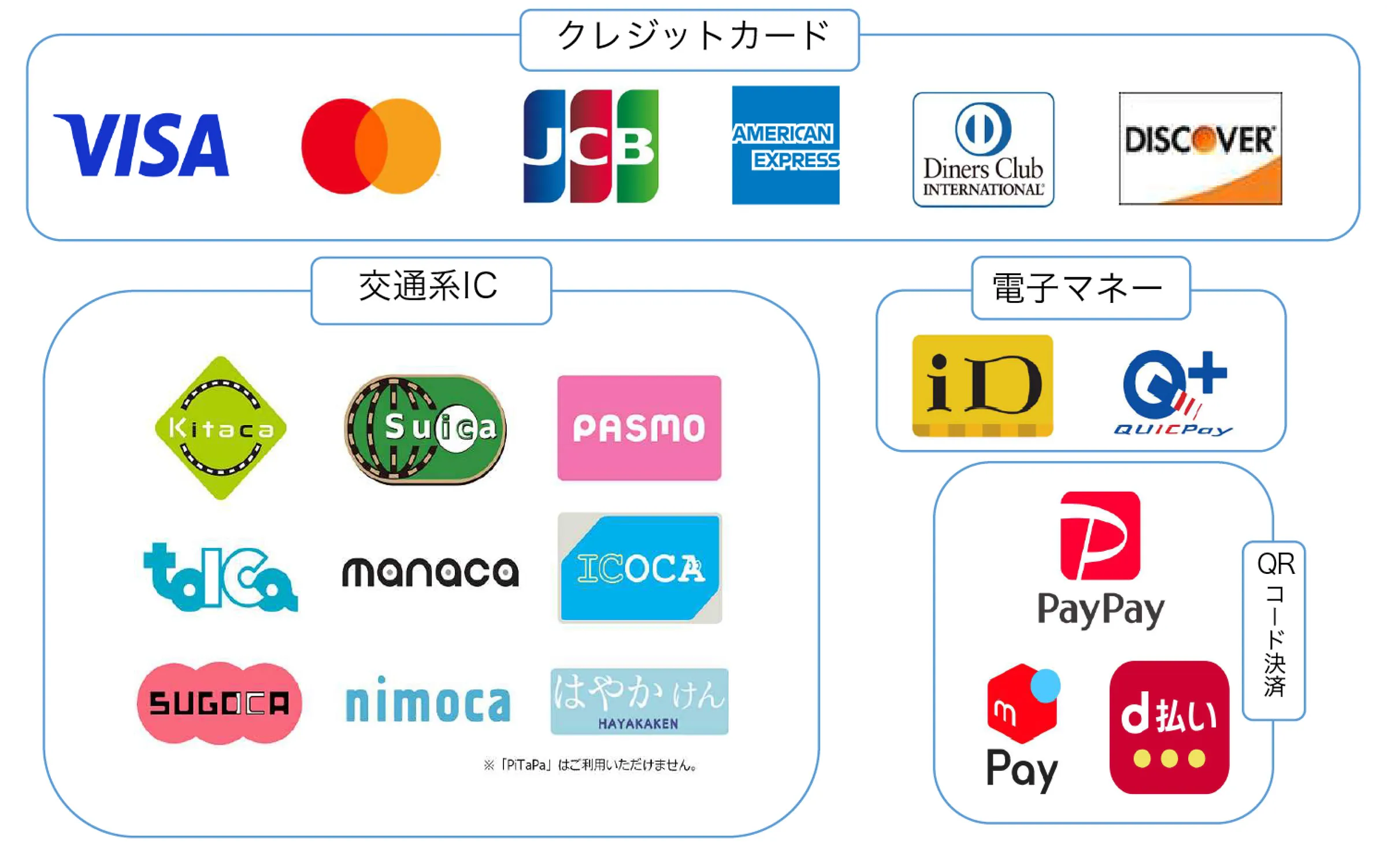 – クレジットカード、交通系IC、電子マネー、QRコード決済